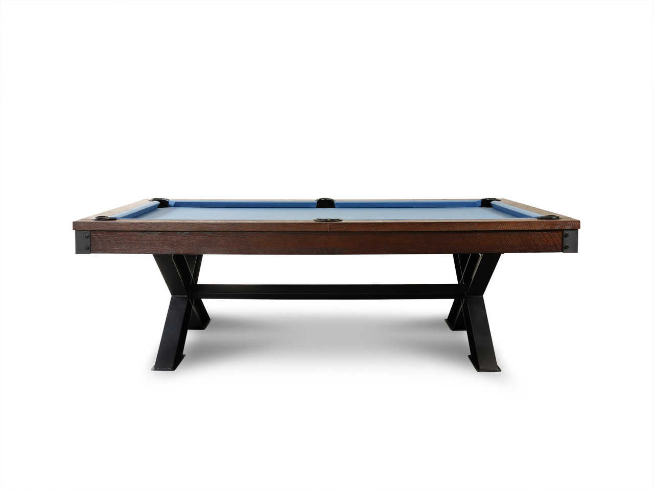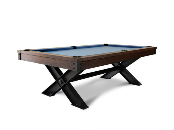 The Pacifica pool table by Golden West Billiards delivers a bold modern industrial presence with its striking X-frame base and exposed metal accents. A clean, substantial cabinet rests atop intersecting steel supports, creating a dynamic architectural silhouette that blends warm craftsmanship with rugged structural design. The cross-braced base not only defines its contemporary style but also provides exceptional stability and strength for long-term performance. Built with a precision-leveled slate playing surface and professional-grade cushion rails, The Pacifica offers tournament-quality play while making a powerful statement in today’s modern game rooms, lofts, and upscale residential spaces. Available in a variety of custom finishes for a fully personalized look.
